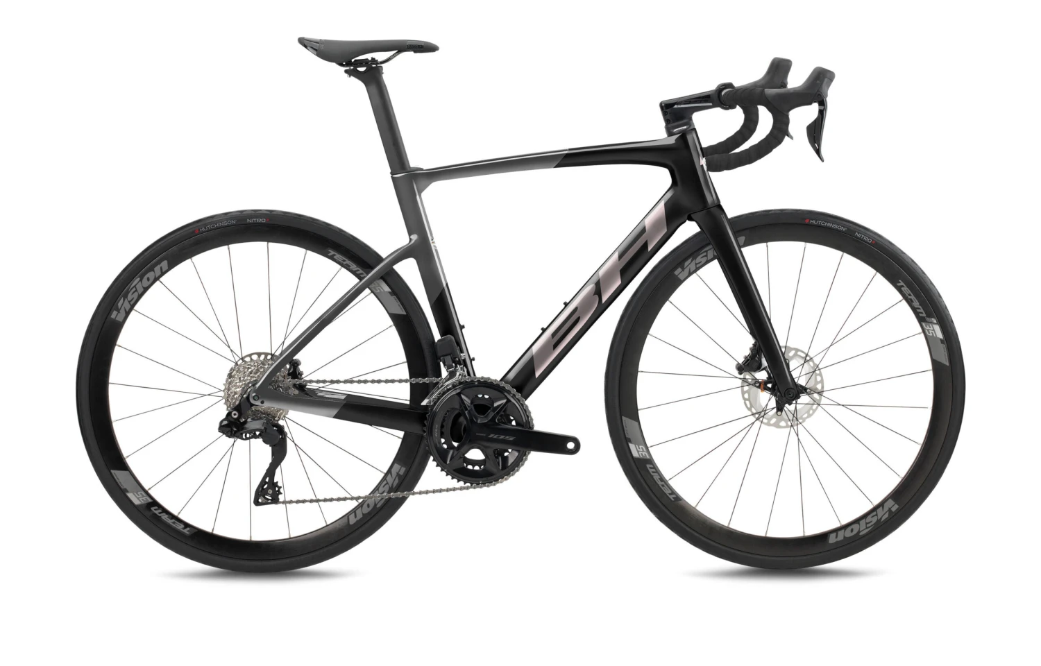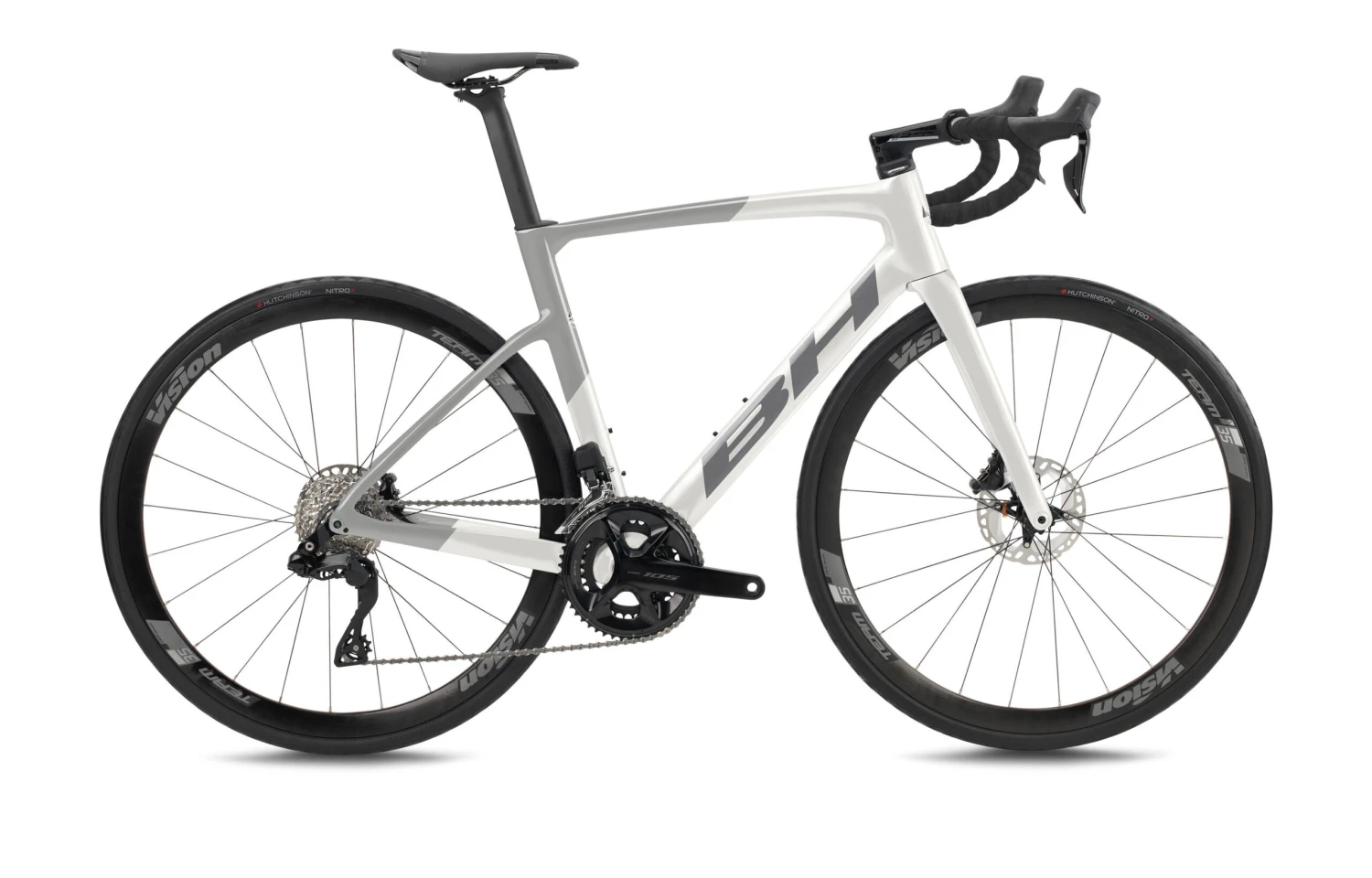 Nueva BH RS1 3.5, 100 % carbono, con un diseño aero pero con una geometría de gran fondo, además se ha diseñado con un cableado interno al 100%, para un cuadro limpio y sin cables, equipada con el nuevo grupo electrónico Shimano 105 Di2 de 12v. y unas ruedas Vision Team 35.