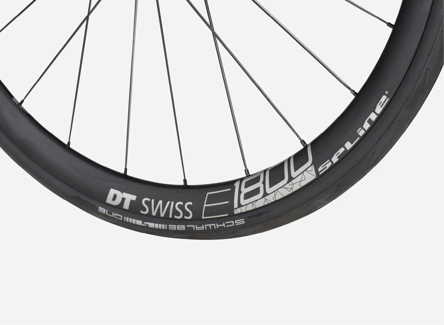 Ruedas Dt-Swiss E1800 Spline: Equipada con una llanta grande de aluminio con una altura de 32 mm, un buje Spline con un sistema de rueda libre con trinquetes y radios Aero, esta rueda robusta le seguirá en todas sus aventuras cotidianas.